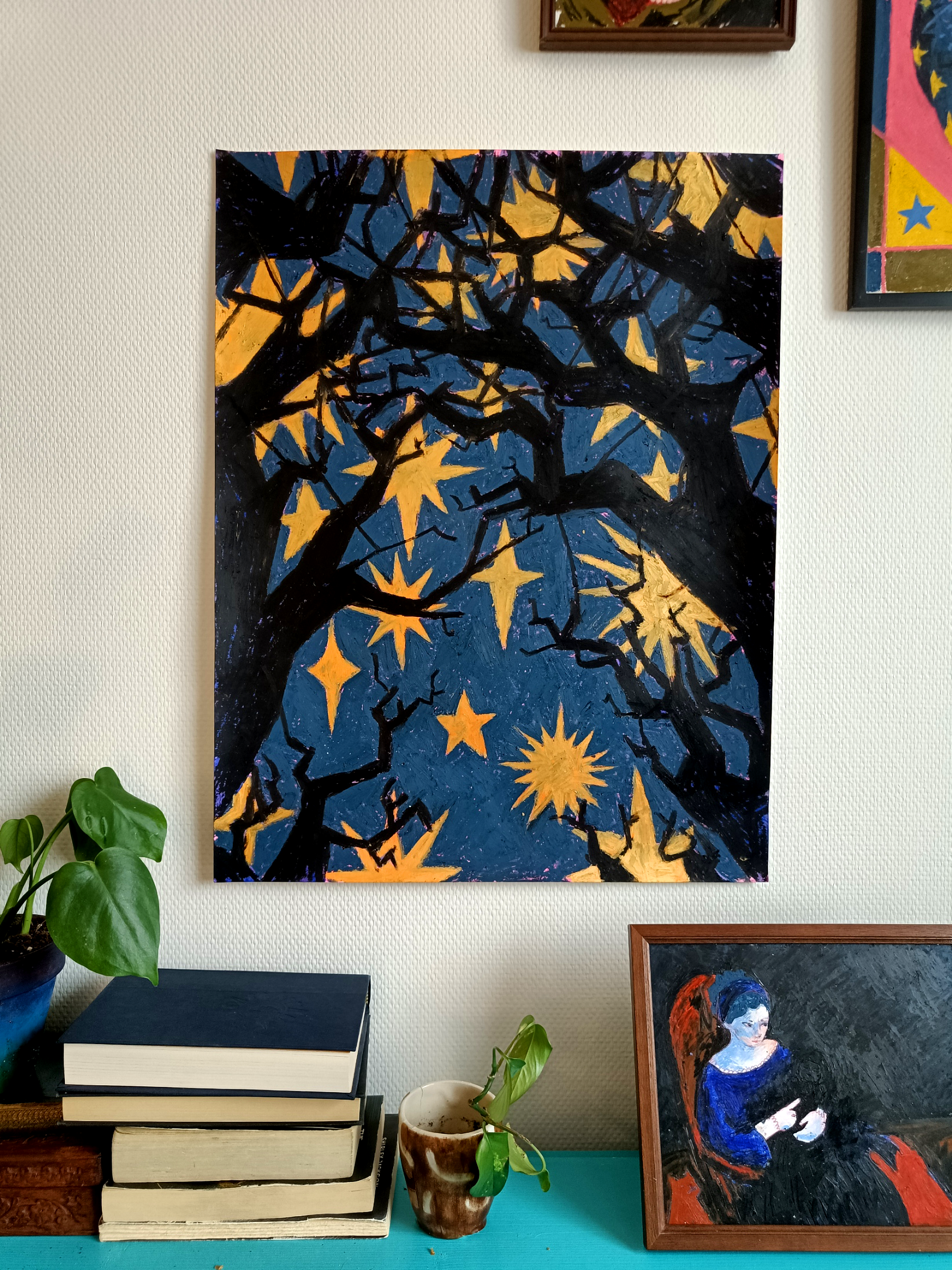 Acryilic paint and oil pastel on paper.